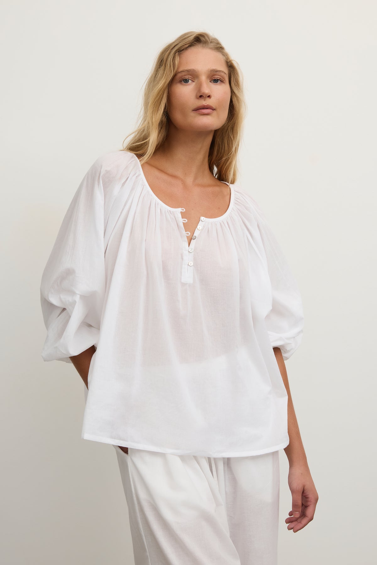 The Bower Blouse is a wardrobe essential, crafted from white lightweight cotton. Designed for a loose fit, it has a gathered neckline and gently puffed sleeves. Style yours tucked into high-rise jeans.
